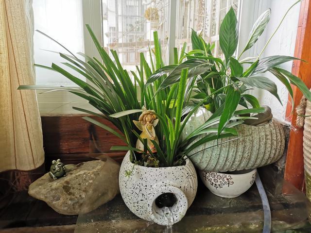 谁知道,偏偏就造就了这个“阳台鱼池”,试想一下,炎炎夏日,在室内也能心旷神系,欣赏着潺潺流水,鱼戏莲叶! 好吧,我已经喜欢上了。 鱼池的四周,种着几株绿色的植物,虽然不是什么珍贵的植物,但按照主人的说法,那些比较普通的植物,都长得很好。 仔细一看,还有铜钱草、兰花、吊兰等植物,点缀在阳台上,这是普通人家所没有的。