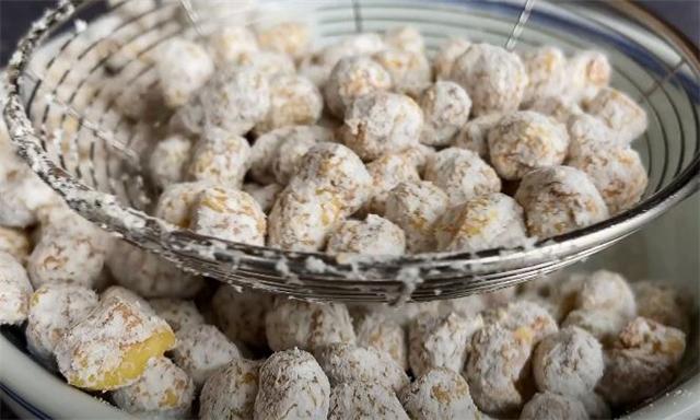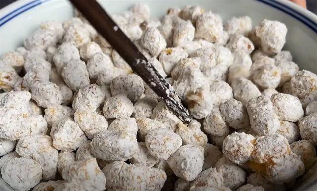 4.拌匀以后往里面加入淀粉,什么淀粉都可以,这里要注意的是淀粉的用量,千万不要一次性加太多,可以边搅拌边根据花生米的实际情况再添加,在搅拌的过程中,如果有粘在一起的花生,用筷子把它夹断就可以,最后搅得像这样粒粒分明不粘黏就可以了。
