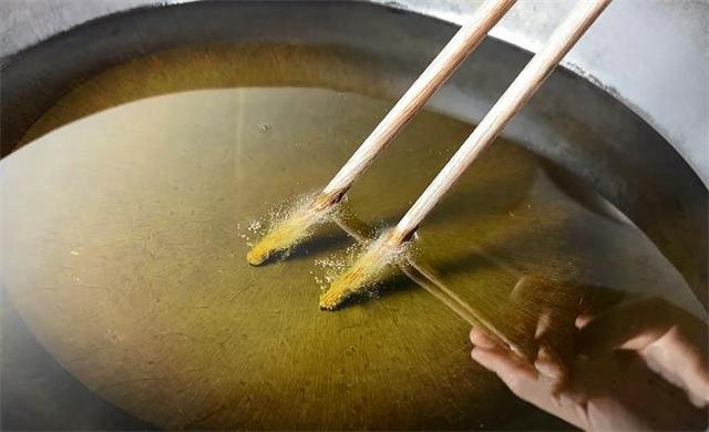 7.下面开火把锅烧热,然后往锅里面多倒一些油,先试一下油温,筷子放进去周围起稀稀拉拉的小泡,像这样五成油温就可以,油温千万不要太高。