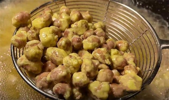 9.这个时候的花生米还不够酥脆,等把油温升高,再倒进去复炸一次,复炸的时候最好不要超过20秒,10秒钟左右就可以,因为花生米很容易炸糊的,我们宁可炸得嫩一点也不要炸糊了,现在我们先把炸好的花生米捞出来。