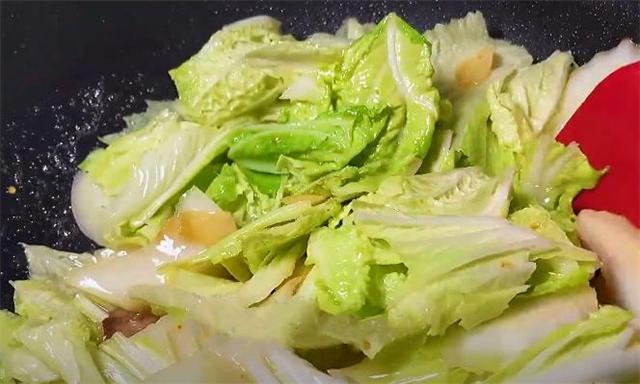 9.再另起一锅,倒入适量的食用油,油热以后把姜蒜片和辣椒加进来炒香,炒出香味后再把白菜帮加进来翻炒均匀,白菜帮一定要先炒,不能和白菜叶一起炒,白菜帮炒至断生以后,再把白菜叶加进来,然后继续翻炒,把白菜叶炒软,白菜叶很容易熟,所以不用炒的时间太长,像这样炒软就可以了。