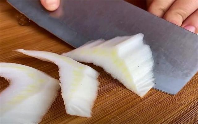 1.首先我们把白菜的叶子一片一片地掰下来,在白菜两边切上一刀,把白菜帮切下来,全部切好以后,把白菜帮斜刀切成3毫米左右的薄片,尽量切得大一点,切好以后放入碗中,放一边备用。