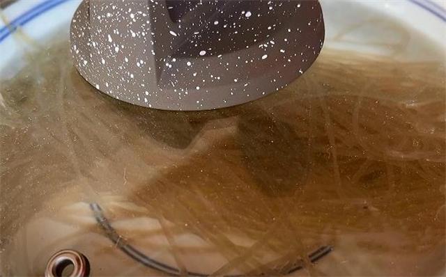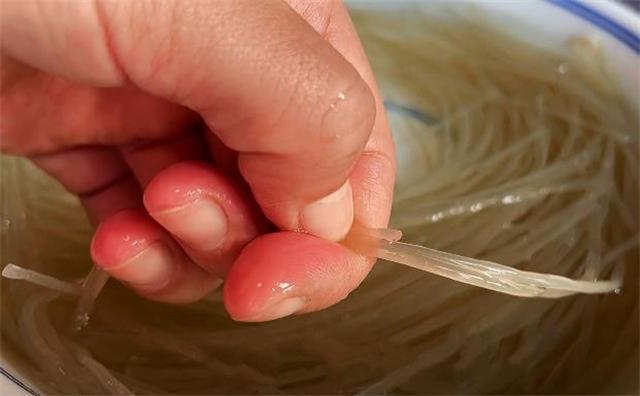 7.这会儿我们的粉条也已经泡好了,用这个方法泡出来的粉条不软不硬,吃起来特别的有嚼劲,而且只需要几分钟就能泡好,然后把粉条控水捞出来,放入碗中备用。