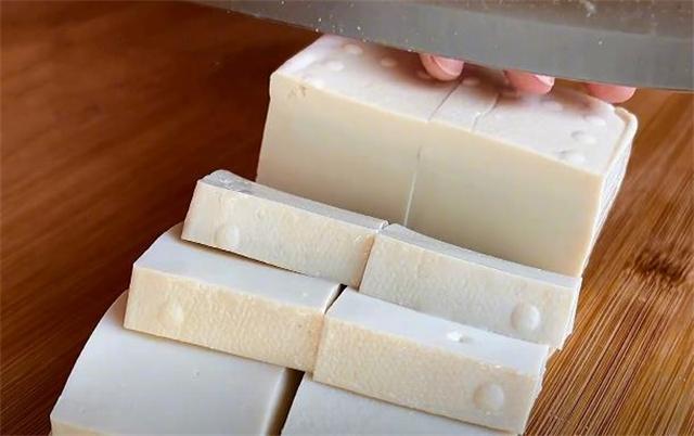 3.接下来准备一块老豆腐,先把它对半切开,再把它改刀切成薄片,这里可以稍微切得厚一点,吃起来口感会更好,切好以后放入碗中备用。