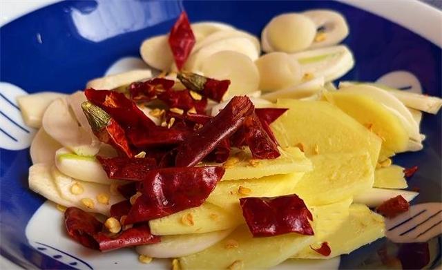 4.准备一小块生姜,去皮后把它切成薄片,再准备一把大蒜切成薄薄的片,全部切好后放入碗中,再准备几个干辣椒用剪刀剪成小段,不喜欢吃辣的可以少放一点,剪好以后放一边备用。