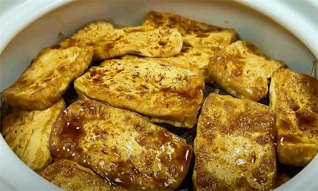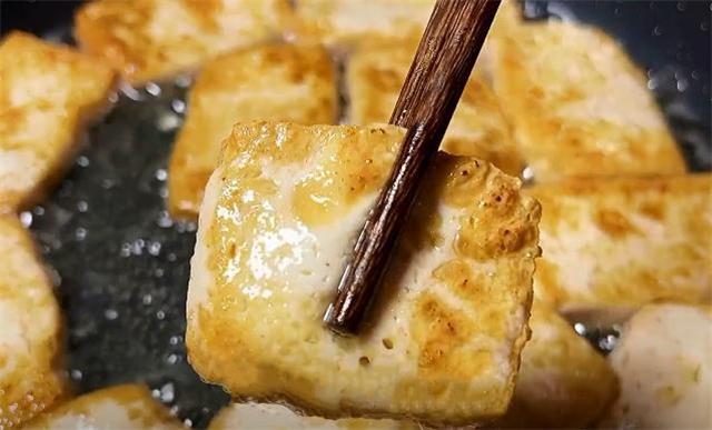 8.现在我们开火把锅烧热,加入适量的食用油,油热以后把豆腐放进去煎一下,开小火慢慢煎,豆腐煎至一面金黄后把它翻个面,全程开中小火慢慢煎,豆腐不要煎得太老,太老的话吃起来会发硬,把豆腐煎至两面金黄,像这样就可以了,然后把它盛出来放入盘子里面。