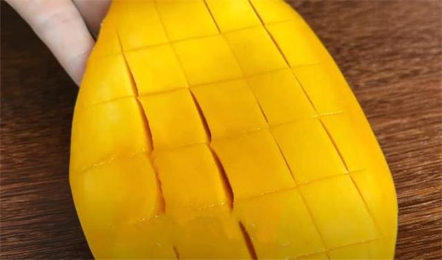 12.划好以后把芒果向外翻转一下,这样果肉就露出来了,吃的时候一口一个,非常的方便,尤其是给小孩吃最合适了。 |