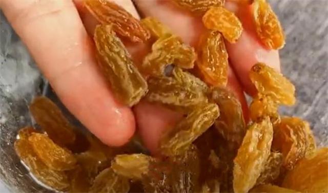8.下面外面准备一把葡萄干放进小碗里面,往里面加入一勺面粉,用筷子把它搅拌均匀,使每一粒葡萄干都裹上一层面粉,因为葡萄干的表面有很多的褶皱,面粉可以有效地吸附掉葡萄干表面的脏东西,搅拌均匀后往里面加入清水,把它清洗一下,洗干净后把葡萄干过滤出来,再次加入清水,把它多清洗两遍,看一下,现在我们的葡萄干已经清洗的非常干净了,把它放一边备用。