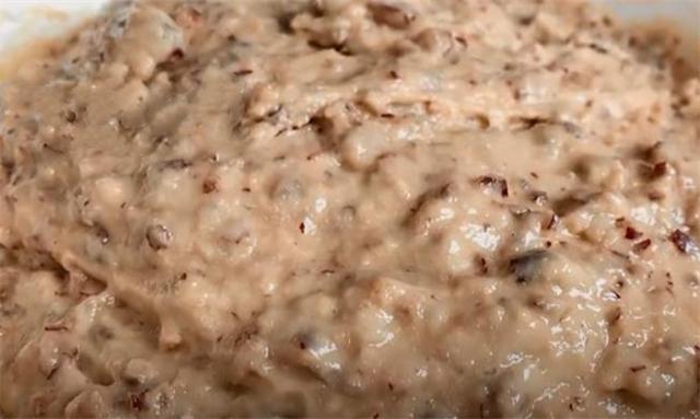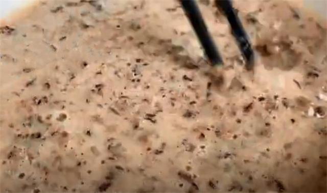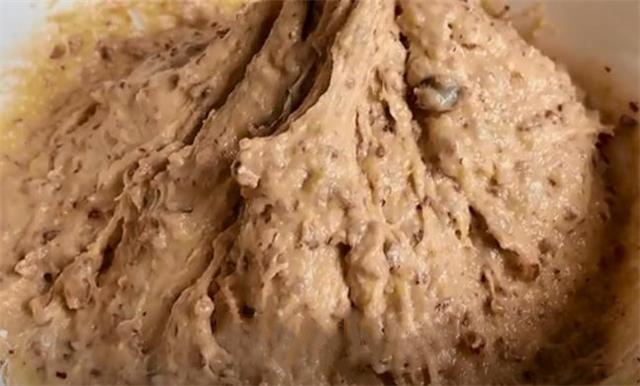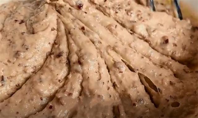 6.这会儿我们往里面加入面粉,然后用筷子把它搅拌均匀,搅拌均匀后再次加入面粉,我这里一共加了大约300g的面粉,分两次加入是为了搅拌的更加均匀细腻,把它搅拌成这种粘稠状。