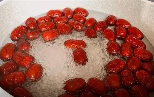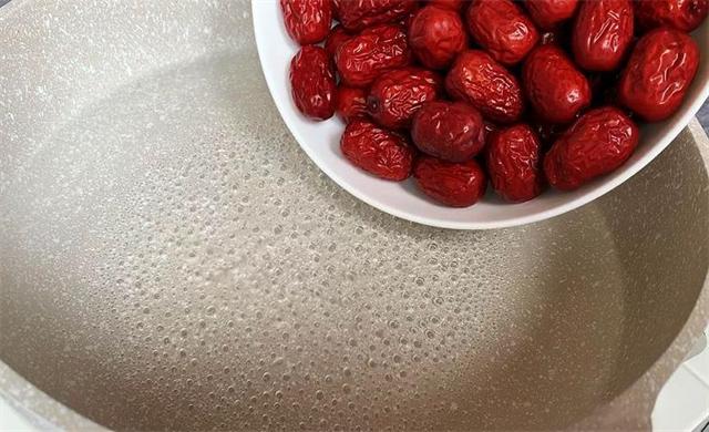 2.现在往锅里面加入适量的清水,盖上盖子,开大火烧开,烧开后把红枣倒进去,盖上盖子开小火煮5分钟。