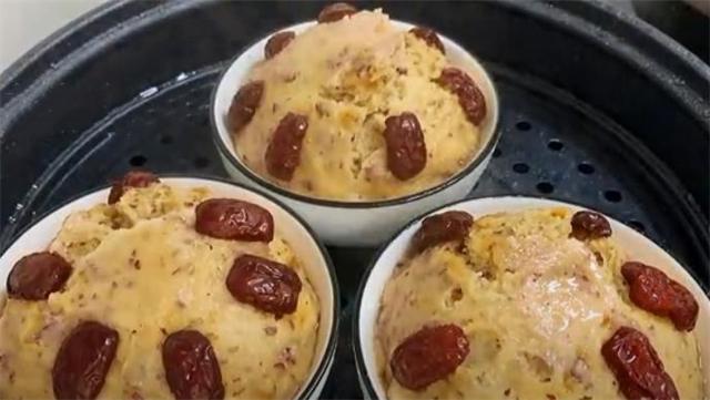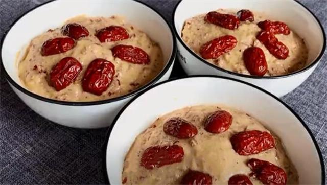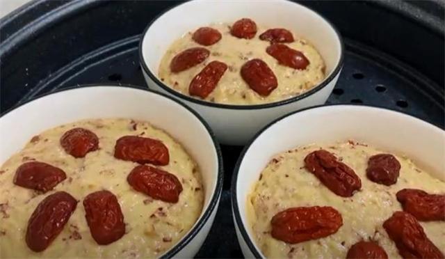 10.接下来我们准备3个小碗,在碗的底部和四周都刷上一层油,然后把洗好的葡萄干放在碗的底部,全部放好以后再把面糊慢慢倒进来,注意不要倒太满,倒六成满就可以,用勺子把面糊表面整理平整,在面糊表面也刷上一层油,锁住水分,最后在面糊上面像我这样摆上红枣片点缀。