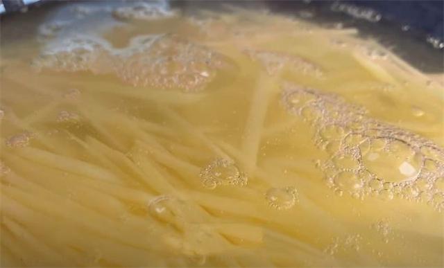 4.准备两个小土豆,大的准备一个就可以,先把它切成薄片,再切成细丝,切好放入碗中,加入清水把它浸泡一下,防止土豆氧化变黑。