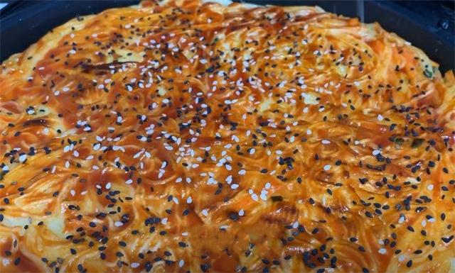9.时间到,我们在上面挤上一点番茄酱,用刷子把它刷均匀,最后撒点熟芝麻增香。