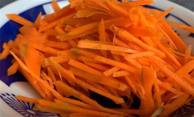 3.下面准备一根胡萝卜去皮,先把它切成薄片,再把它切成细丝,切好放碗里面备用。