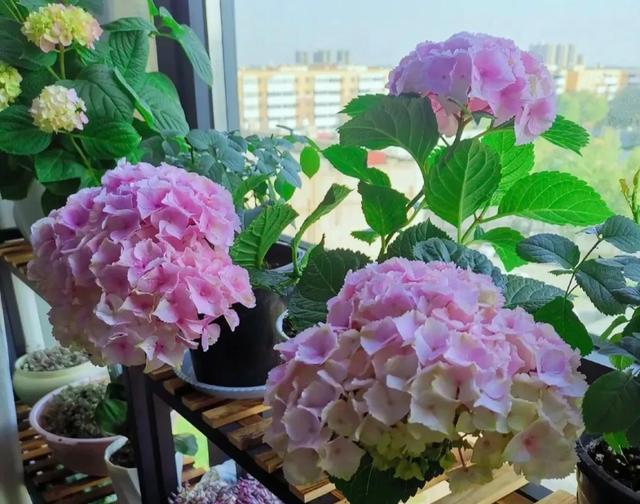 绣球 绣球花也叫八仙花,它是庭院三宝之一,花开时非常烂漫,繁华似锦,有一两盆,就能打造出缤纷绚丽的小花园,美不胜收。绣绣花,除了要多做修剪,促进分支枝,要注意不被强光暴晒,不然叶片容易出现晒斑,花朵也会凋谢。此外,适当补充水分,可防止缺水引起黄叶。