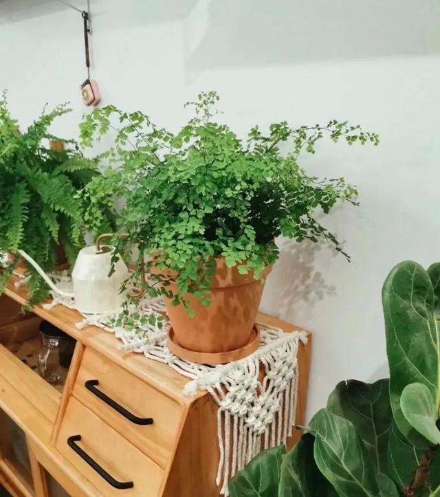 铁线蕨 铁线蕨作为蕨类当中非常重要的一种植物,颜值非常高,叶片又非常柔软,触摸起来让人很舒服,可以摆放在一个圆形的桌子上,清新自然,高雅独特。铁线蕨喜欢生长在湿润明亮处,浇水的时候可以向托盘里补充水分,从底部吸收,可以预防基部叶片枯黄,日常每天中午向液面上喷雾,增加湿度。
