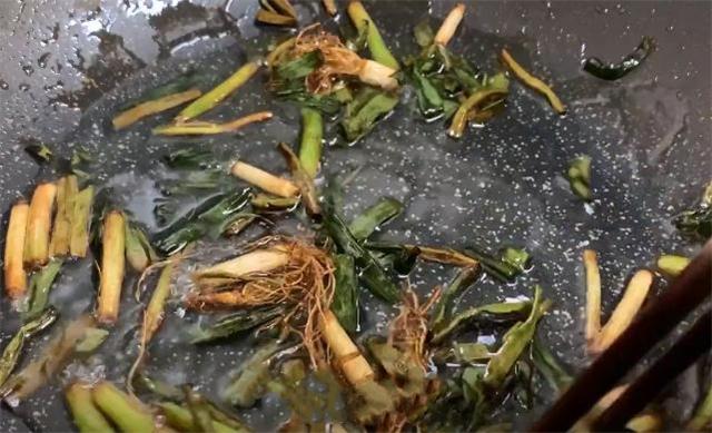 5.现在我们开火把锅烧热,烧热以后往里面加入适量的玉米油,油烧热以后把葱段放进去,用筷子把它搅动一下,开小火煎,一直煎至小葱变得焦黄就可以。