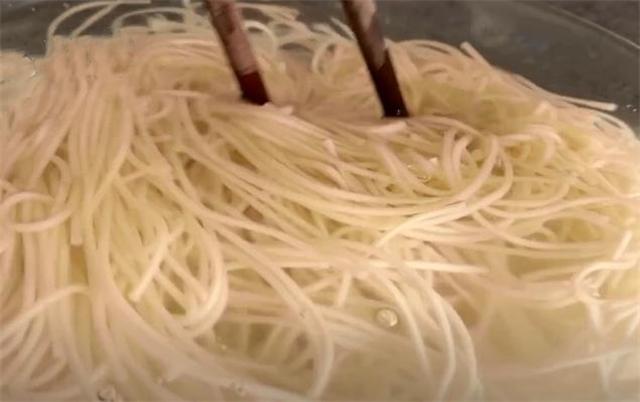 2.现在我们把面条夹出来,放进凉水里面,面条过凉水以后会更有嚼劲,用筷子把它搅拌一下,把它放一边备用。