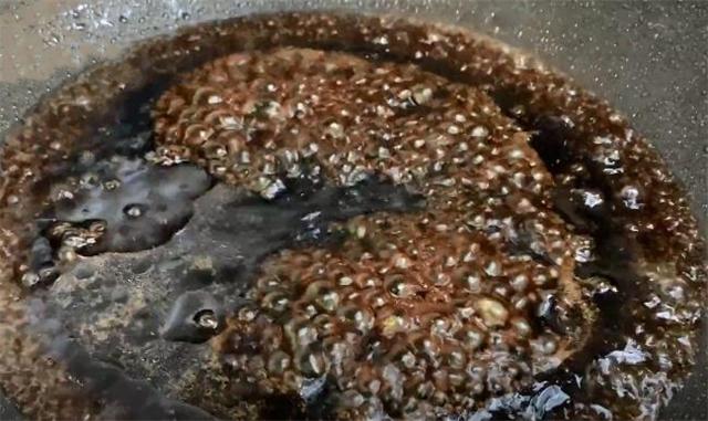6.煎好以后把它夹出来,把它夹干净,再把调好的料汁倒进去,用铲子不停的搅动,把料汁烧开就可以。