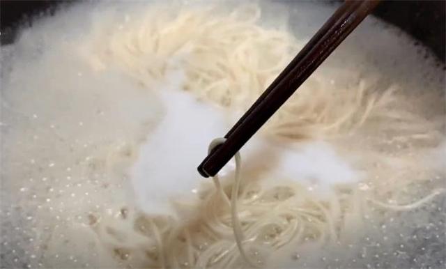 1.首先我们把锅里面的水烧开,水烧开后下入面条,用筷子把面条抖散,防止面条黏在一起,将它煮两分钟,我们在煮面条的时候时间不要煮的太长,煮太长了面条就没有嚼劲了,口感也会大打折扣,煮至像这样用筷子夹一下,能夹断并且没有硬心就可以。