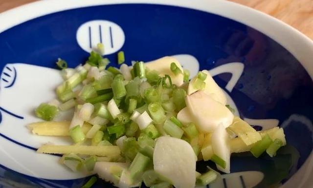 8.准备一把小葱切成葱末,2瓣大蒜切片,生姜切成片再切成丝,切好放入碗中备用。