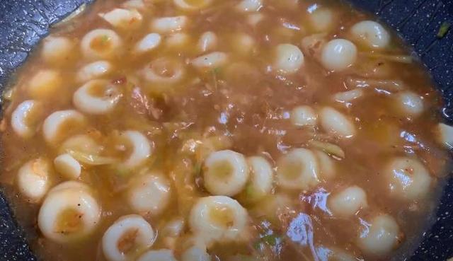 9.锅里面加入适量食用油,油热以后下入葱姜蒜末爆香,再加入一勺黄豆酱,炒出红油后加入一碗清水,盖上盖子煮开,煮开以后下入山药小窝窝搅拌一下,煮两到三分钟就可以了,最后加入一点水淀粉勾芡,汤汁变得粘稠就可以出锅了。