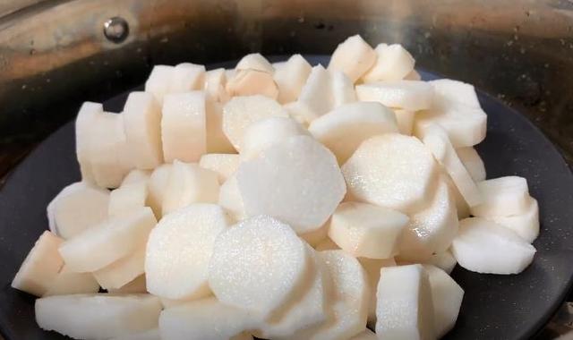 1.先把山药的皮削掉, 因为人体的皮肤对山药的黏液会敏感,所以你可以和我一样戴上手套,全部削好以后用刀切成厚片,切好装进一个盘子里面,然后把它放进蒸锅,盖上盖子,开大火蒸15分钟。