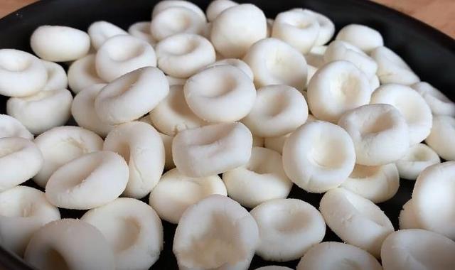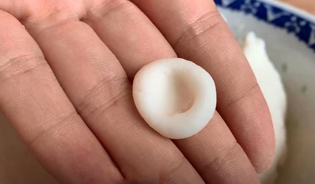 4.再加入一倍量的土豆淀粉,再加一勺食盐,用筷子搅拌成絮状,搅成絮状以后下手揉成团,揉光滑以后取出一小坨,用手先把它捏一下,然后搓成一个小圆球,再用手指在中间戳一下,像这样一个小窝窝就做好了。
