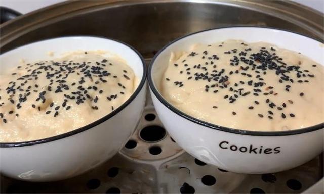 4.这会儿面糊已经醒好了,用筷子搅动一下,把里面的气泡排出来,准备两个小碗,在底部和边缘都刷一层油,这样方便脱模,往里面加入几粒葡萄干,加大枣和其他果干也可以,然后把面糊倒进碗里面,最后撒点黑芝麻增香,然后放进蒸锅,盖上盖子二次醒发10分钟,醒好后开大火把它蒸30分钟。