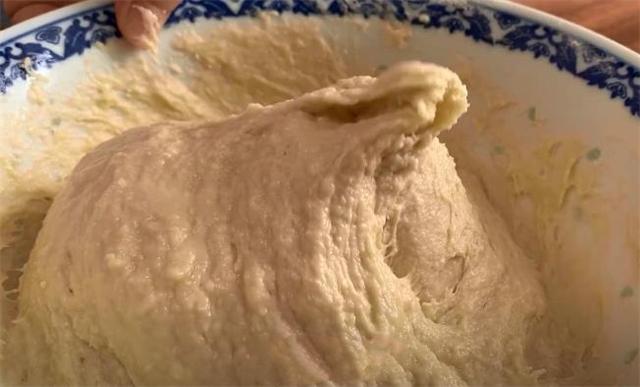 3.接下来准备一个大碗,往里面倒入300g面粉,再加入一勺糯米粉,大概50g左右,往里面加入3g酵母粉,2g泡打粉,20g白糖,再把刚才打好的梨汁慢慢倒进去,边倒边搅拌,梨汁大概是120毫升左右,最后搅拌成这种偏干一点粘稠的面糊就可以了,盖上盖子醒发40分钟。