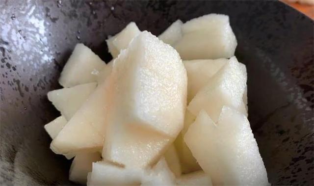 1.先准备一个梨用刀把它去皮,然后把果肉切下来,中间的核不要,再把梨切成条,再切成小方块,切好放碗里面。