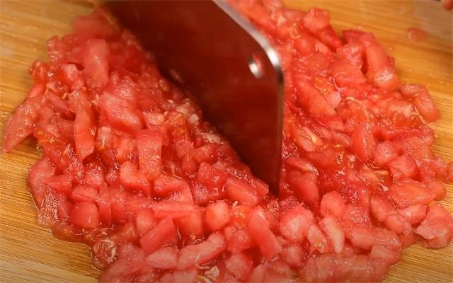2.去皮之后把西红柿切成块,然后再给它切成这样的小碎丁,切好之后倒入碗中。