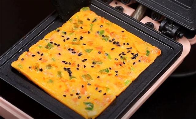 5.早餐机刷上一层食用油倒入面糊,然后再撒上一点黑芝麻,盖上盖子给它烙两分钟左右,我们再给它翻个面继续烙,来回翻面烙熟之后美味即成。