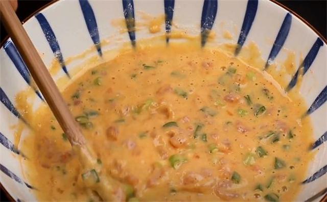 4.接着我们再准备一根素火腿肠给它切成火腿丁,同样放入碗中,加适量的食盐和十三香,用筷子搅拌均匀,拌匀后再加入一大勺面粉,给它搅拌成这样没有干面粉的糊状即可。