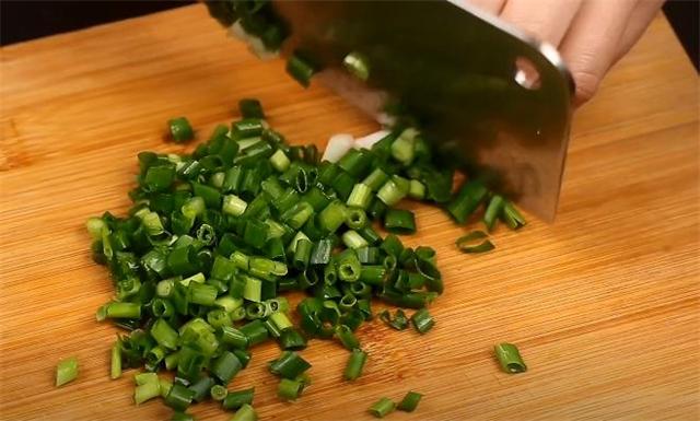 3.再准备几根小香葱,我们给它切成葱花,切好之后装入碗中,和西红柿放一起。
