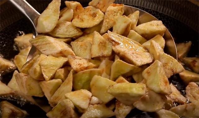 6.起锅烧油,把油温烧至六成热然后下入茄子炸,刚下锅先不要动,让茄子炸至定型,炸至定型之后注意来回翻动一下,让茄子受热均匀防止炸糊了,炸至金黄熟透,外焦里嫩之后捞出控油。