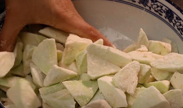2.然后往茄子上面分次少量的加入玉米淀粉,用手抓拌均匀,让茄子上面裹上一层淀粉,接着再加上一次玉米淀粉,让茄子都这样均匀地裹上玉米淀粉。