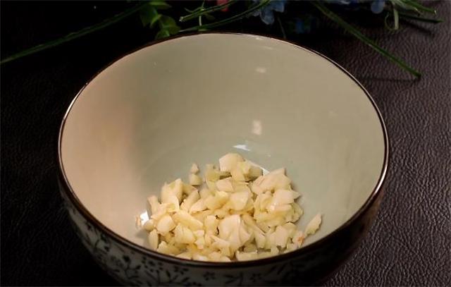 4.然后再准备几个大蒜用刀拍一下,切成蒜末放入碗中备用。