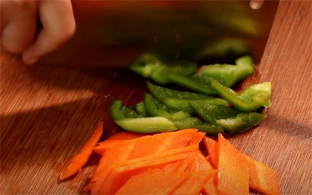 3.准备少许的胡萝卜,切成片,再准备半个青红椒切成小块。