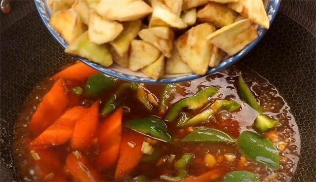 7.锅留少许底油然后倒入刚调好的料汁,然后大火煮开,把料汁煮至浓稠,放入刚切好的青红椒和胡萝卜翻炒均匀,再倒入炸好的茄子,接着大火给它翻匀,翻拌均匀之后即可出锅。
