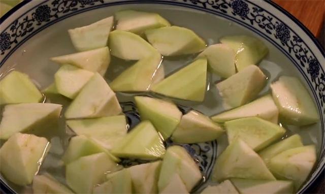 1.先把茄子去皮,去皮之后把茄子一分为四份,然后把茄子切成滚刀块,切好之后放入到清水当中清洗一下,方便茄子裹上淀粉。