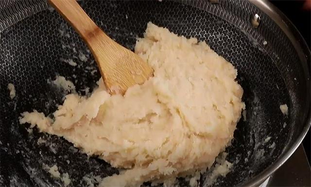 2.关火之后再准备200g面粉,把面粉倒入开水中,用铲子给它搅拌,一直搅拌到这种没有干面粉的状态。