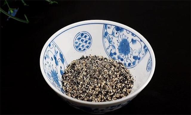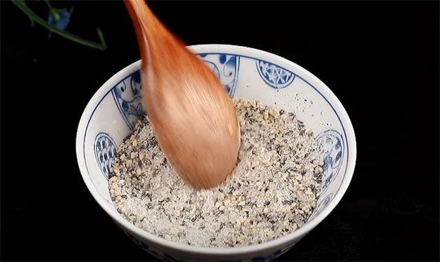 4.锅中加1勺黑芝麻和1勺白芝麻,把它们炒香,炒香之后放入到捣碎器里面,然后给它们捣碎,捣碎之后放入到碗中。