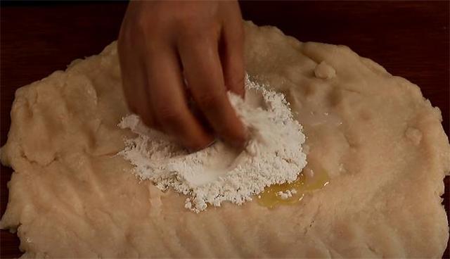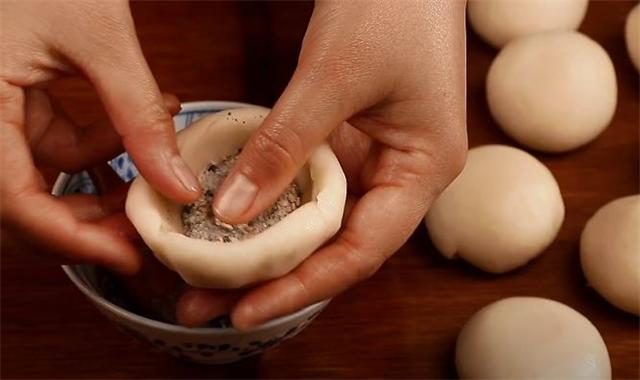 8.把小剂子揉圆,再把小剂子做成鸟窝状,然后放入适量的馅料,像包包子一样包起来,刚才馅料里面加入了面粉,这样的作用是糖化了之后糖不容易流出来。