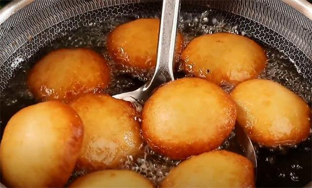 10.锅里加入适量的食用油,用筷子测一下油温,筷子冒气泡就可以下锅炸了,把饼坯慢慢的放进去,炸的时候注意来回翻动一下,让其受热均匀,全程开中小火慢炸,慢慢的这个饼坯就鼓起来了,炸成这样金黄熟透后捞出控油。