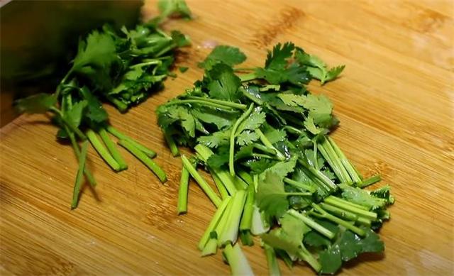 2.接着我们再切一点香菜,把香菜切成这样的小碎段,切好之后放到洋葱丝里面。