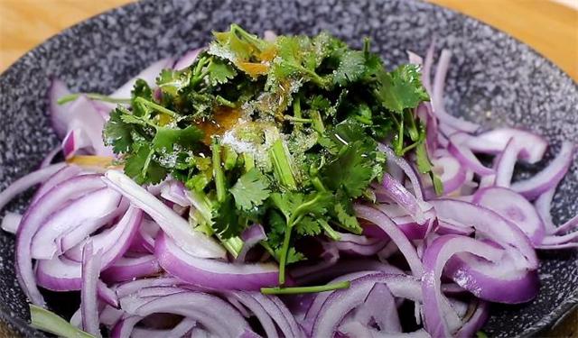 准备食材: 洋葱、香菜、生抽、香醋、白糖、盐、小磨香油 具体做法: