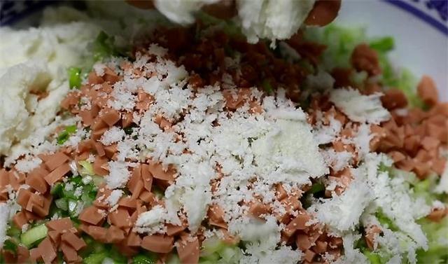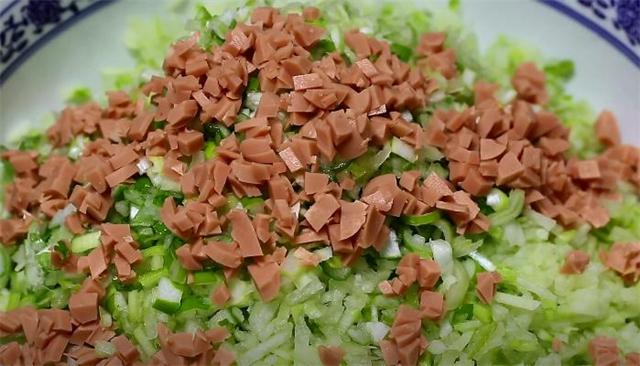 1.萝卜洗净之后用擦丝器给它擦成细丝,擦好之后用刀给它剁成碎末,然后装盆里,再准备一点大葱给它剁碎之后一起放入盆里面,一根素火腿肠切成火腿丁之后也加入里面。