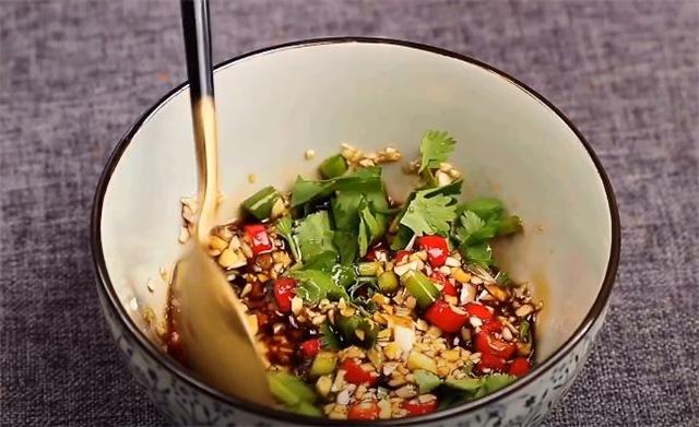 4.再加入适量的食盐和少许白糖,再加两勺生抽和一勺陈醋,加入一勺的小磨香油,家里有条件的再放点香菜,用勺子把料汁搅拌均匀。