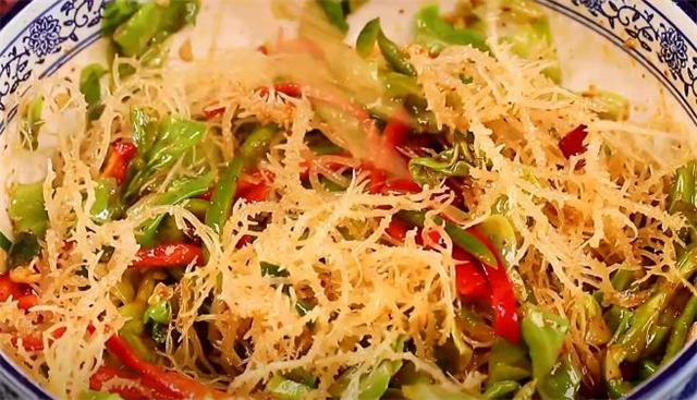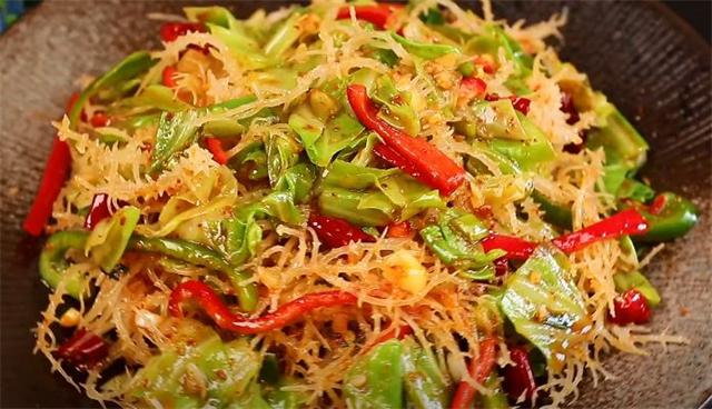 准备食材: 包菜、龙须菜、青椒、红椒、大蒜、小葱、干辣椒段、辣椒面、盐、食用油、生抽、香醋 具体做法: